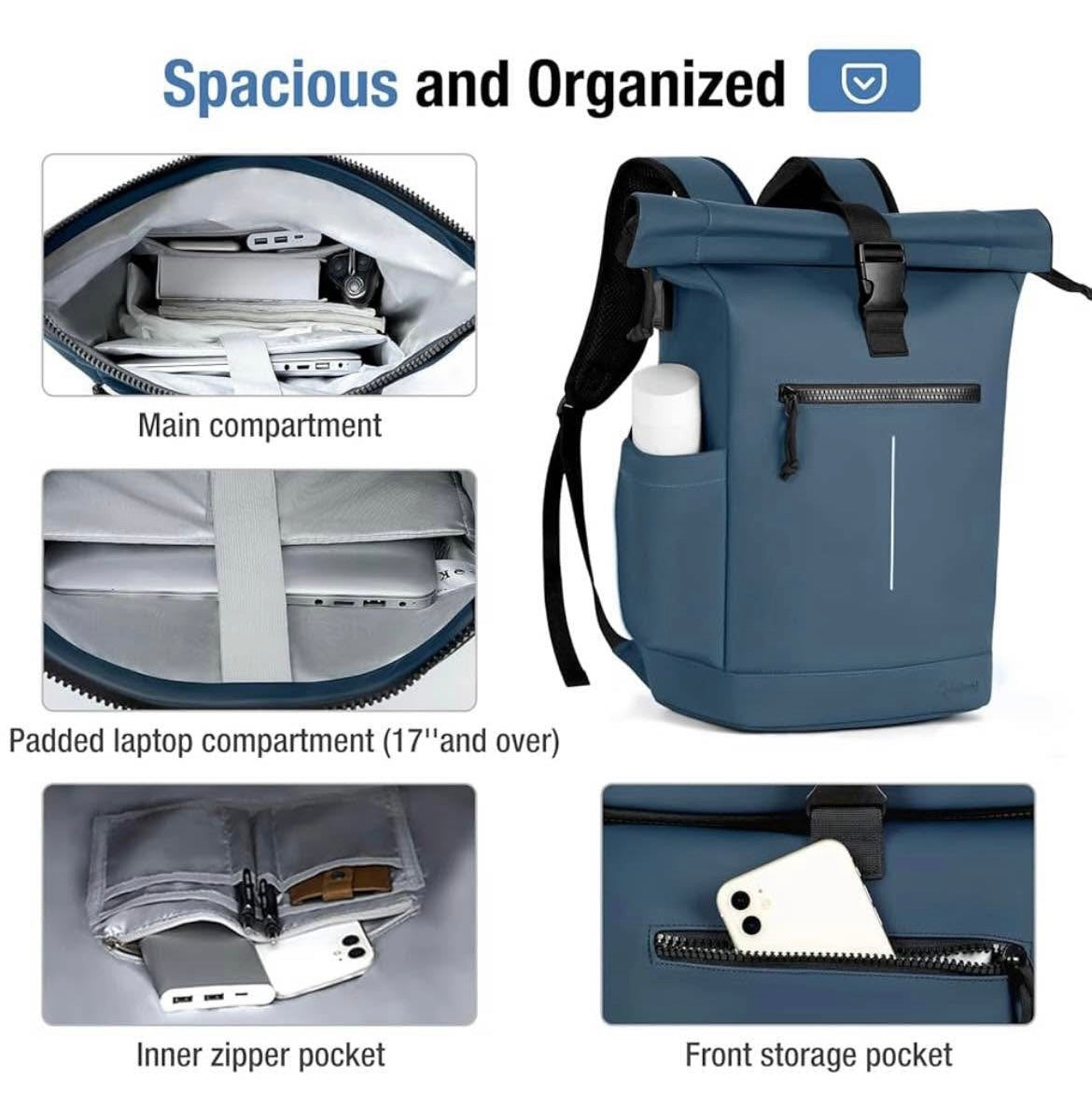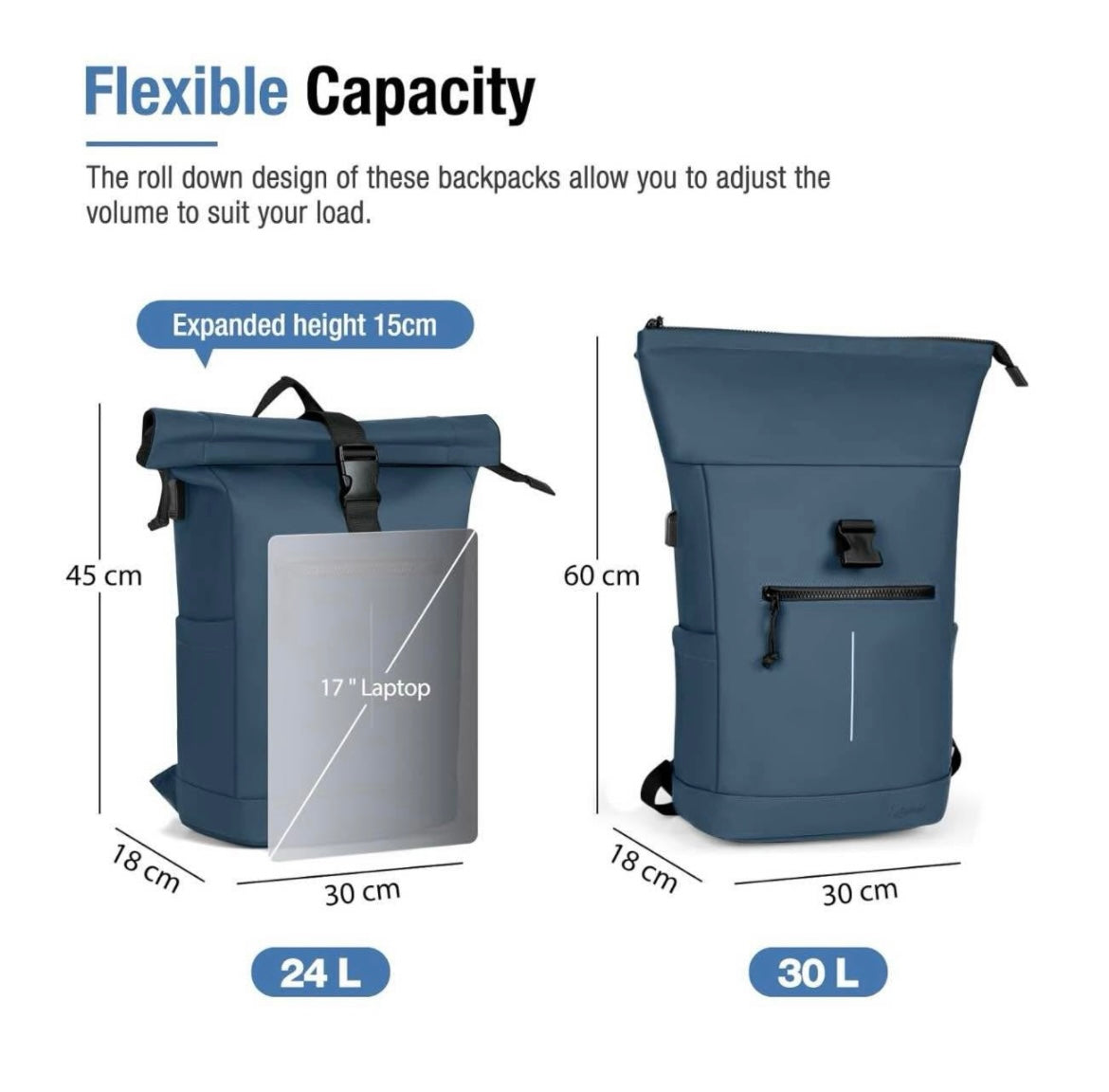 Extendible capacity: designed to fit your needs, the adjustable roll extends from 24 L (45 × 30 × 18 cm) to 30 L (60 × 30 × 18 cm), giving you more space for all your work, school or travel essentials