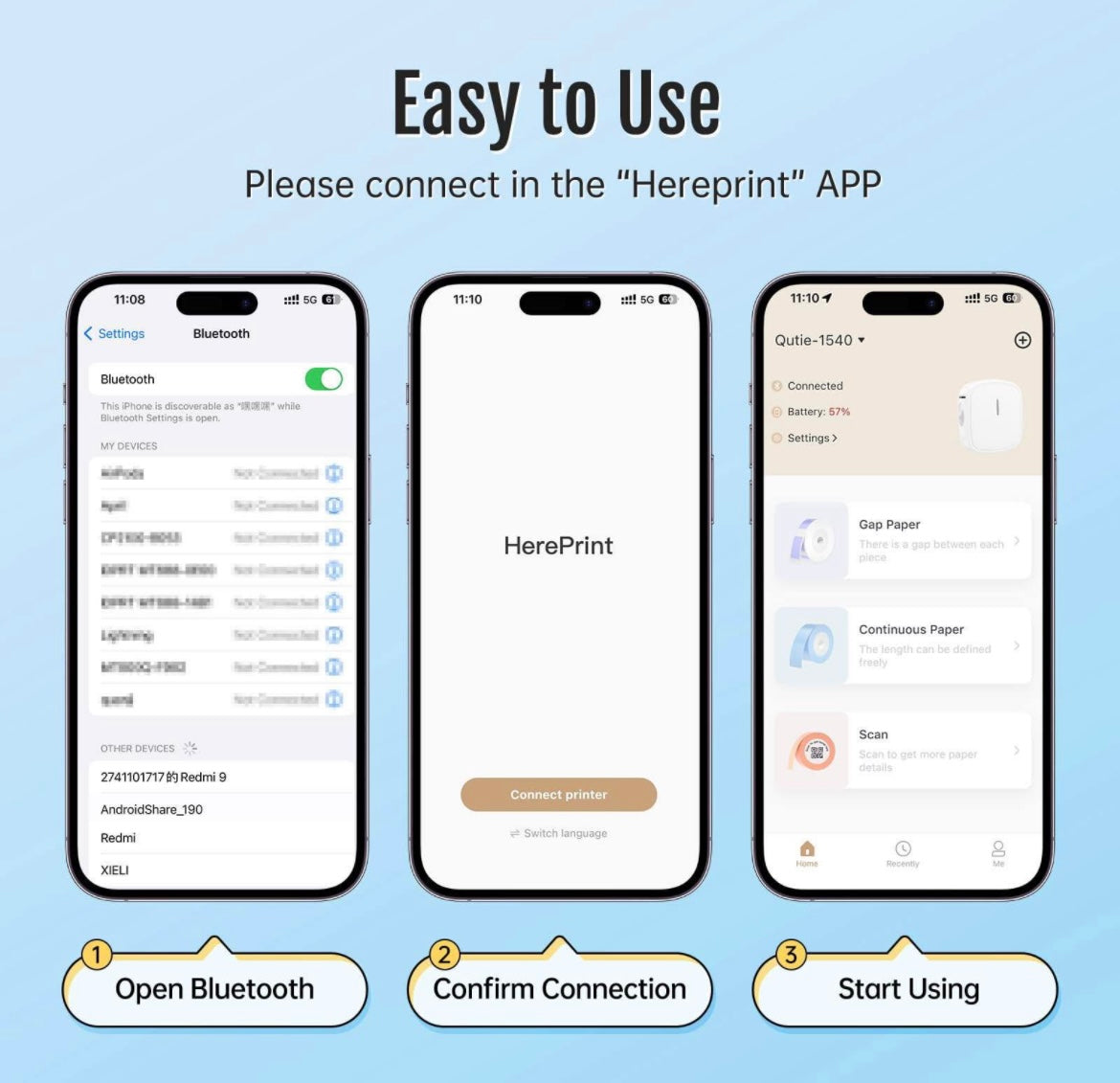 APP INSTALLATION & USAGE:Install the selection app from App Store and Google Play >>Open the APP and labeling machine >>Select Qutie model from the menu>>Activate Bluetooth and click the connect button >>Start your entertainment printing journey.