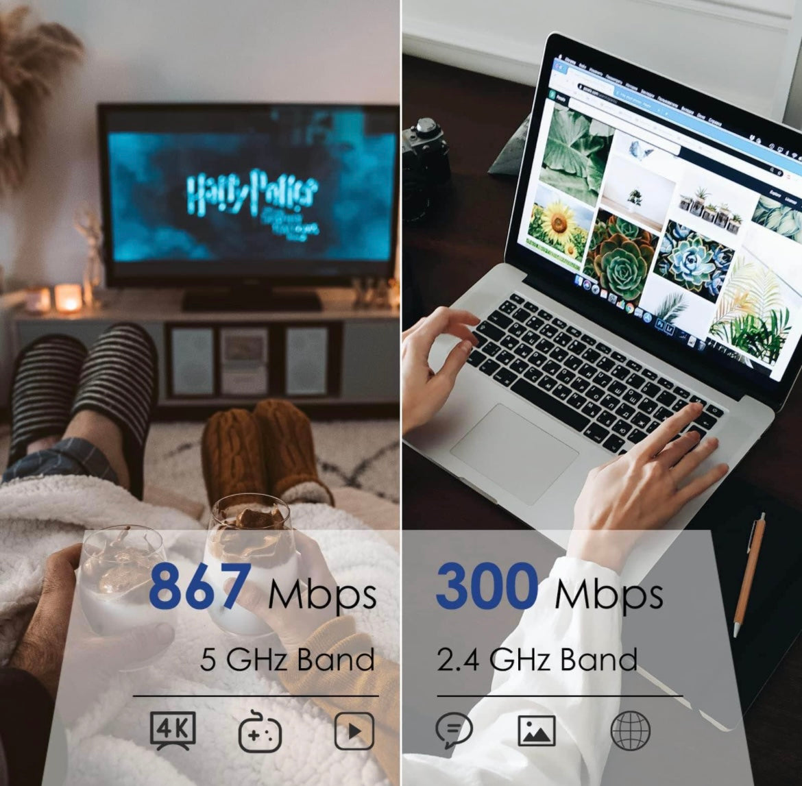 【Dual Band WiFi Router】Dual band router is used to connect more wifi devices. The total network speed is around 1200 Mbps. 900Mbps in the 5GHz band and 300 Mbps in the 2.4GHz band. Simple tasks such as email or web browsing can be handled by the 2.4GHz band, while bandwidth-intensive tasks such as online gaming or 4K video streaming can be handled by the 5GHz band. More than 64-128 devices can be connected at the same time.